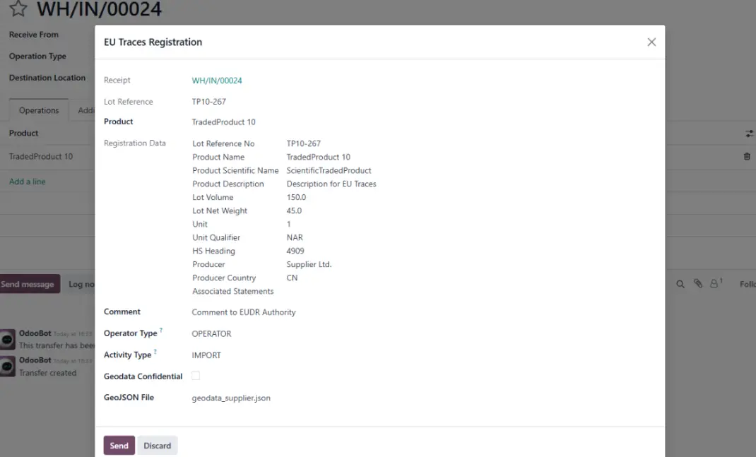 Voer DDS-gegevens in bij inkomende leveringen en laat Odoo ze automatisch controleren via EU Traces.